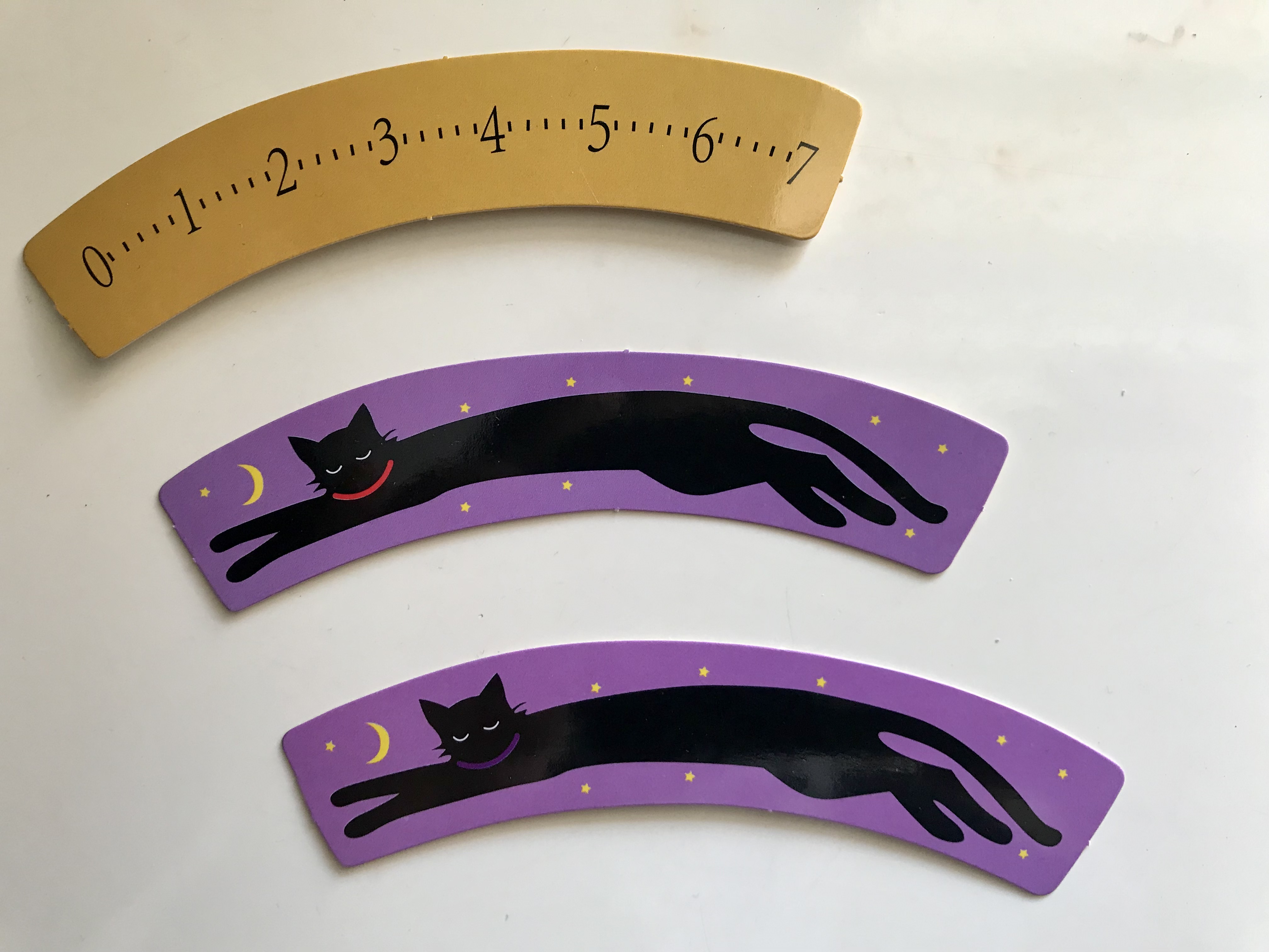 扇形に湾曲した、猫のカード2枚と定規のカード1枚。